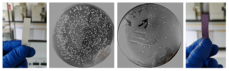 臭氧化处理前后KI淀粉试纸和培养皿菌落数变化对比照片