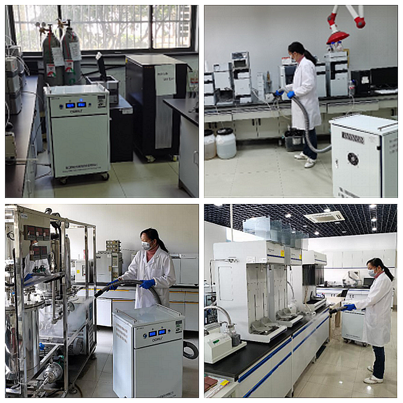 不同实验室臭氧杀菌防控现场照片(左上,气熏蒸实验室整体;右上,雾化喷洒液质联用仪实验室;