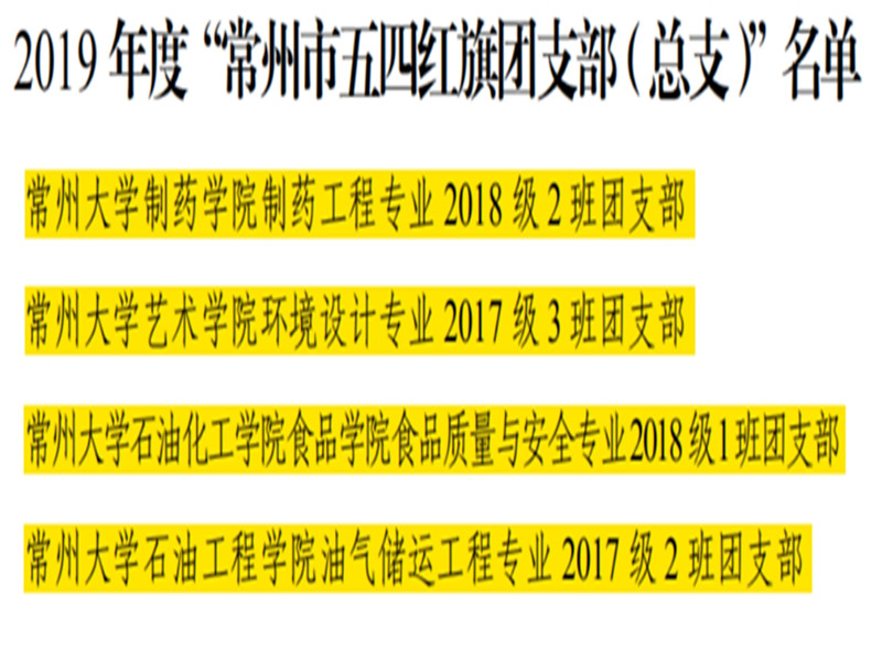 外围官网食品质量与安全专业2018级1班团支部荣获“常州市五四红旗团支部”称号,化学研18汤琳获得了“常州市优秀共青团员”称号。