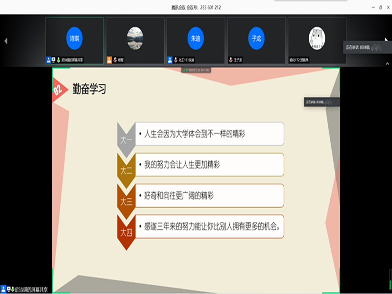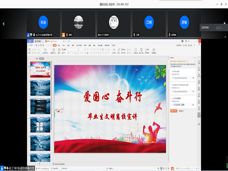 为让大三同学提前做好学业及职业规划,把握时间,赢得机会,外围官网于5月9日以线上学习的方式开展了以“爱国心,奋斗行”为主题的毕业生文明离校宣讲暨“青年讲师团”第八讲。本次宣讲活动由应化161於诗琪和化工161朱迪两位党员代表主讲,17级全体同学参加。