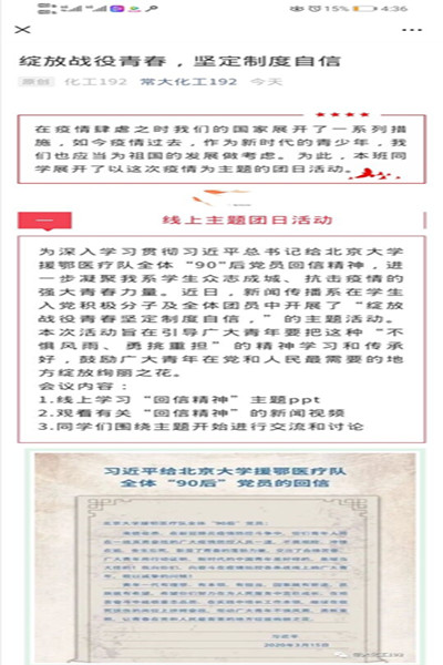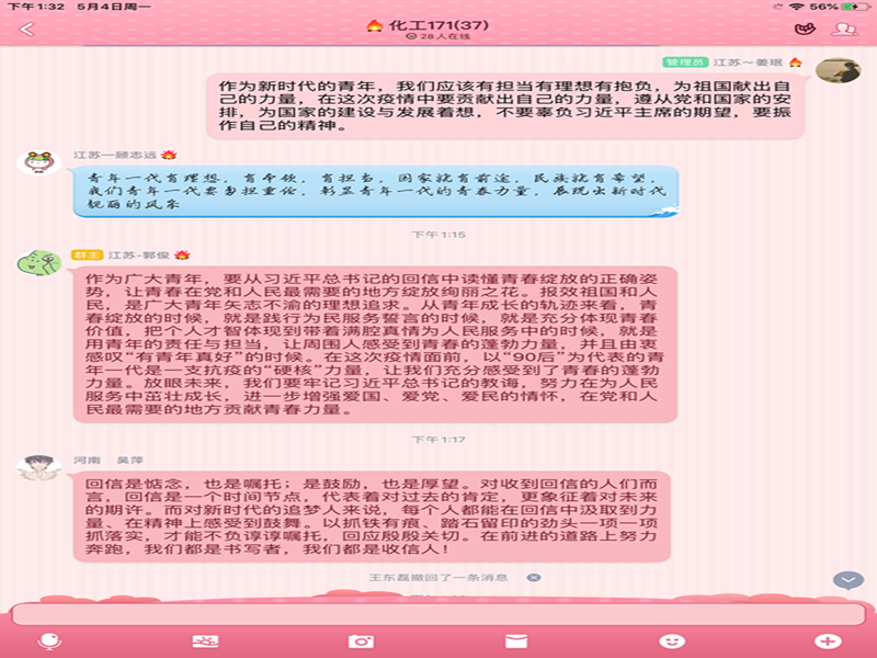 活动以广大团员学生为主讲人,通过QQ、腾讯会议等平台,带领同学们认真学习习近平总书记给北京大学援鄂医疗队全体“90后”党员的回信精神,积极引导大家发表自身感想。学院各团支部认真组织开展主题班会,以主题班会为载体引导大家不忘初心、牢记使命。正如习近平总书记所说的“青年一代有理想、有本领、有担当,国家就有前途,民族就有希望。”作为新时代的青年学子,要肩负起未来的使命与责任,不辜负祖国的栽培,不畏困难,奋勇前进,在实现中国梦的生动实践中放飞青春梦想!