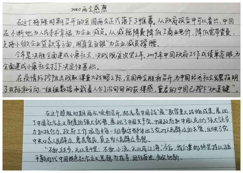学生通过线上观看两会,了解两会召开的背景与意义。在当前全球疫情蔓延的形势下,上学问题、治病问题、复工问题等民生问题成为代表委员的热点话题。观看期间学生们自由讨论两会内容和精神,认真撰写出自己的心得体会。