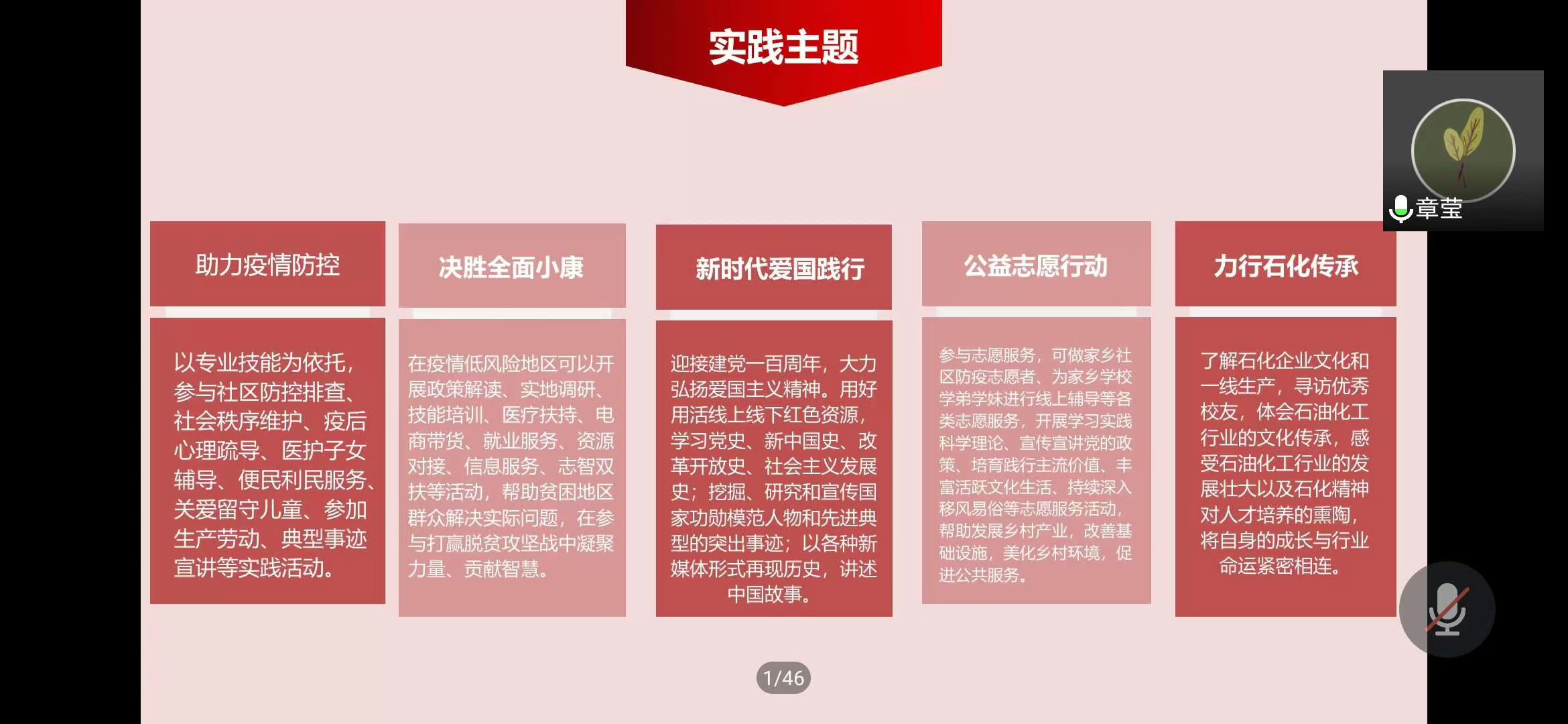 2020年7月18日,石油化工学院食品学院召开2020年大学生志愿者暑期“三下乡”社会实践启动仪式。院党委副书记宣慧、学院全体辅导员、各班团支部书记和社会实践参与者利用腾讯会议线上参与启动仪式。