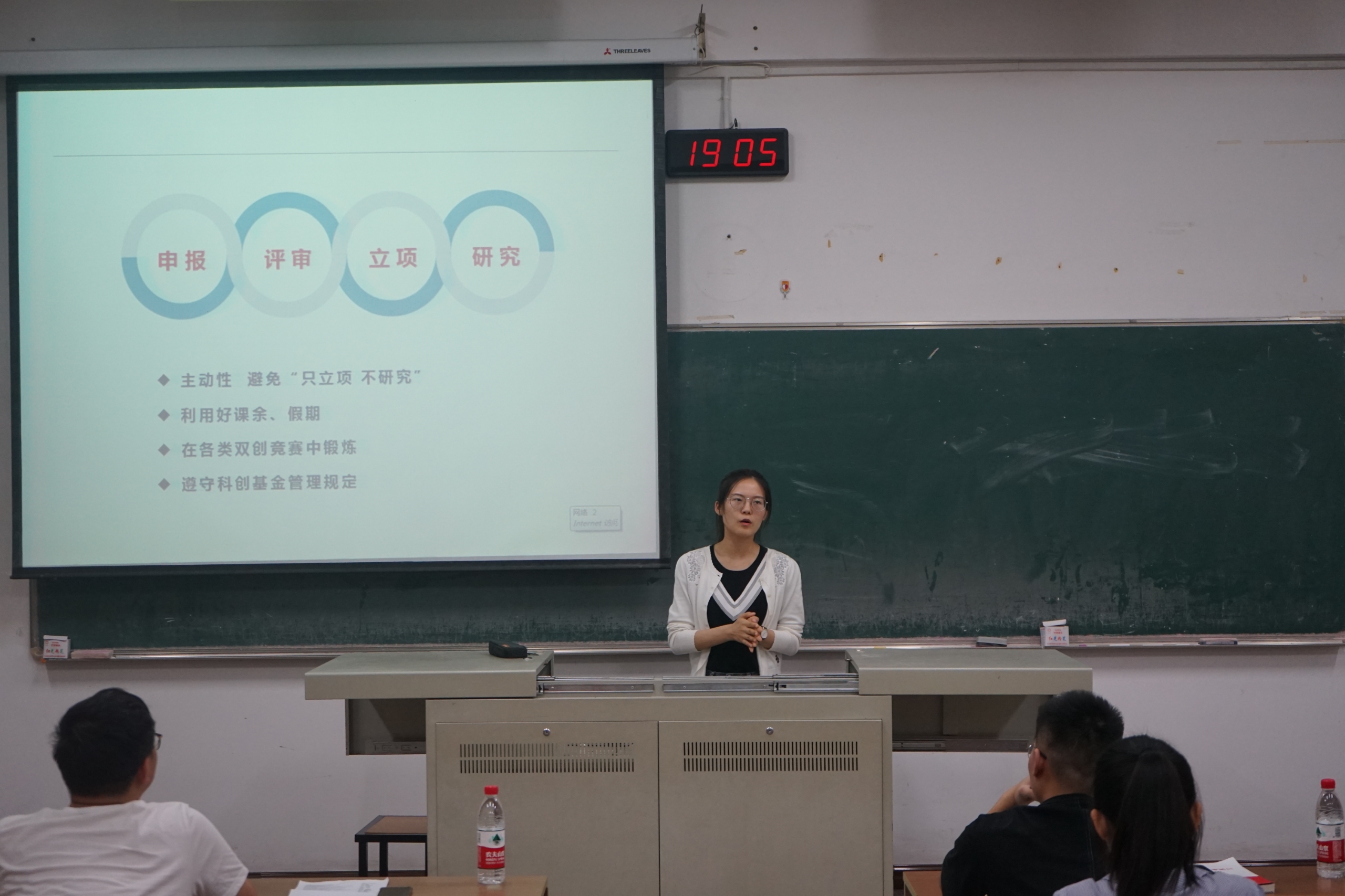 王卓向同学们系统地介绍了大学生双创体系和创新创业赛事,明确了开展科创基金项目的流程和要求,希望同学能够高度重视,珍惜机会,认真谋划,利用课余时间主动走进实验室开展项目研究。鼓励同学们积极参与“挑战杯”、“互联网+”等大学生创新创业竞赛。随后孙宝之结合自身参与科创基金和互联网+大赛的经历,从项目申报、项目实施、专利申请以及参赛视频制作等方面分享了经验和感悟,同时告诉大家要多进入实验室进行实际的操作。