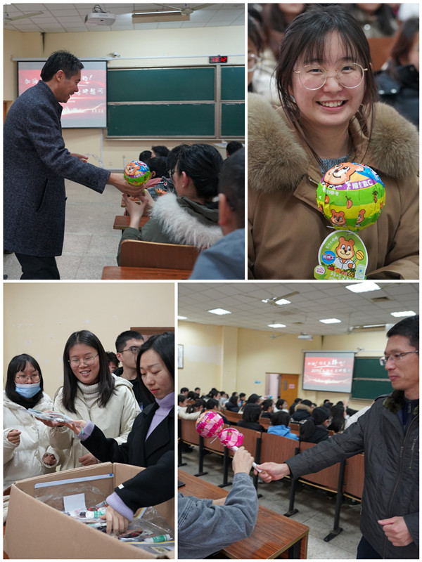 首先,陈海群对正在备战考研的学子们表达了慰问、鼓励、期望之情:希望同学们保持乐观的心态、注意身体健康、明确考研目标、积极备战考研。接着,吴荷平叮嘱大家平衡好考研压力,把生活、学习规律调整到位,全力冲刺,发挥出自己最好的水平。而后,缪老师通过“青春是用来拼搏的,梦想是用来实现的,圆梦考研你们是最棒的!”来鼓励大家考研加油。院领导表示学院是所有考研同学的坚强后盾,会努力为大家提供良好的考研条件,并祝愿大家金榜题名,考上理想院校。最后,学院还为考研学子们发放了“最棒”棒棒糖、“考霸”文具袋,希望同学们坚定信念,全力冲刺,蟾宫折桂,舍我其谁!