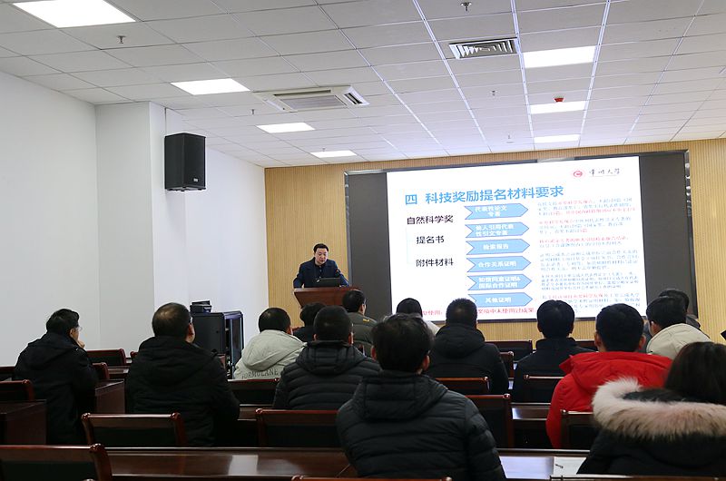1月12日下午校产学研处彭明国处长应邀来外围官网做题为“科技奖励培育与申报”专题讲座。学院相关团队负责人、学术骨干教师聆听讲座。陈海群院长主持讲座。