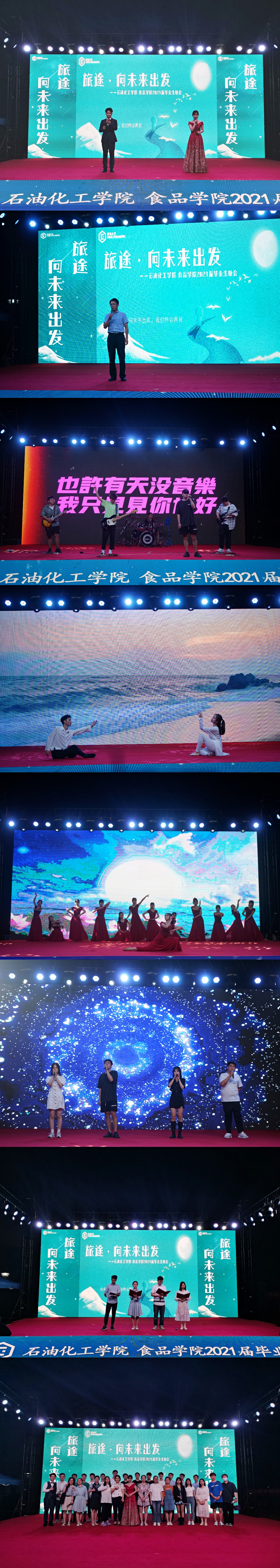 6月10日18:00,由石油化工学院 食品学院主办、21届毕业班承办、学生会协办的2021届毕业生晚会在水月广场上演。院党委书记吴荷平、院党委副书记宣慧、副院长黄海、各专业老师们、辅导员们以及毕业班学生观看了晚会。