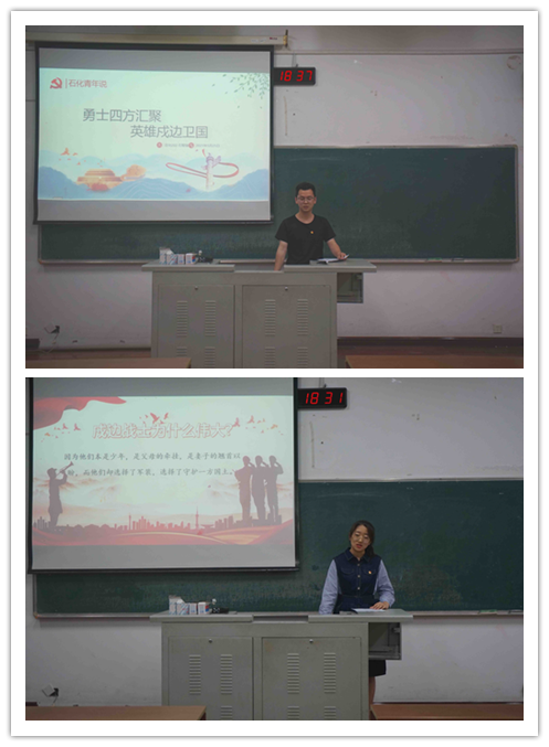 为弘扬爱国民族精神、致敬戍边英雄,讴歌伟大的中国共产党,6月21日晚6:30,外围官网于w1202教室开展以“勇士四方汇聚,英雄戍边卫国”为主题的石化青年说。本次宣讲由团委副书记王博智主持,应化201班王姣杰、应化202班石智锋主讲,各班级代表参加。