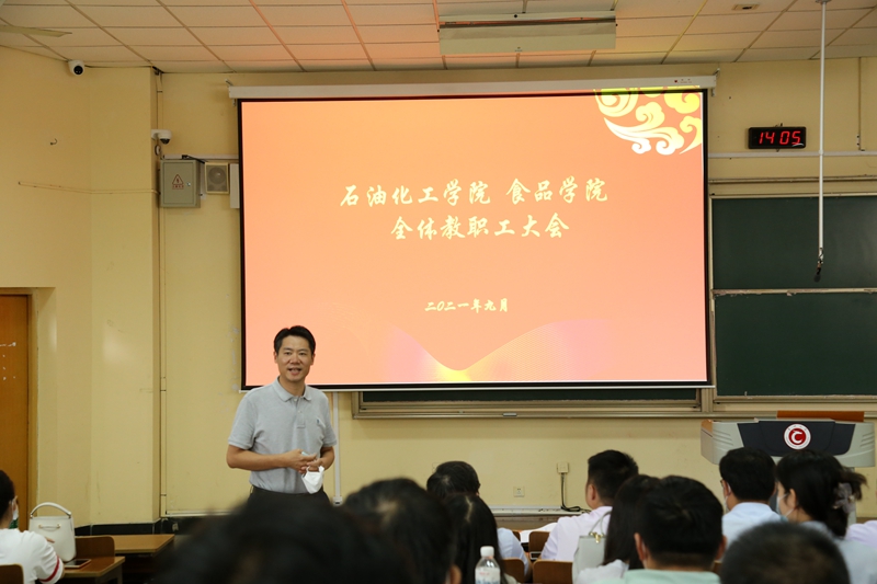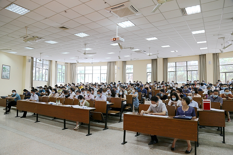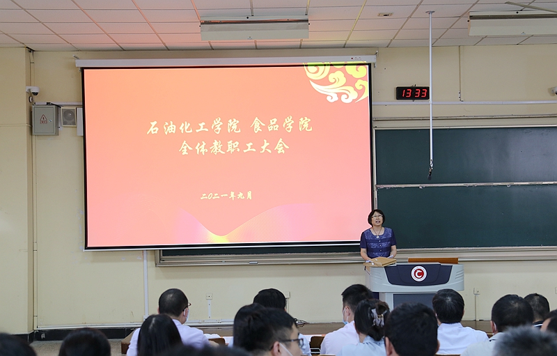 2021年9月16日下午,外围官网党委在武进校区第八阶梯教室召开教职工大会,全体教职工参加了会议,校干部考察组成员王卫星教授、朱静老师到会指导工作,党委书记吴荷平主持会议。
