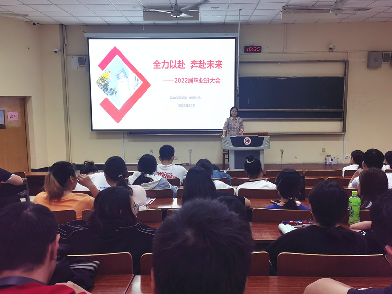 10月14日下午,石油化工学院食品学院毕业班大会在W5阶召开。出席本次大会的有院党委副书记宣慧、副院长黄海、各专业辅导员。2022届全体毕业生参加此次大会,会议由学工办主任方俊主持。