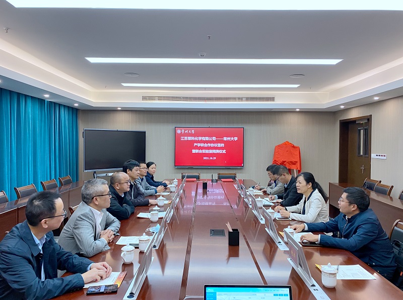 2021年10月29日,江苏莱科化学有限公司-十大体育外围平台app产学研合作协议签约暨联合实验室揭牌仪式在十大体育外围平台app测试实验楼A座1507会议室举行。江苏莱科化学有限公司董事长朱旭东、高级顾问杨建元、副总经理刘建超、总工程师周月根及相关高层人员,十大体育外围平台app石油化工学院 食品学院院长钟璟、副院长钱俊峰,联合化学反应工程研究所十大体育外围平台app分所所长王龙耀、高级工程师吴卫忠及学院成员参加会议。钱俊峰主持成立大会暨揭牌仪式。