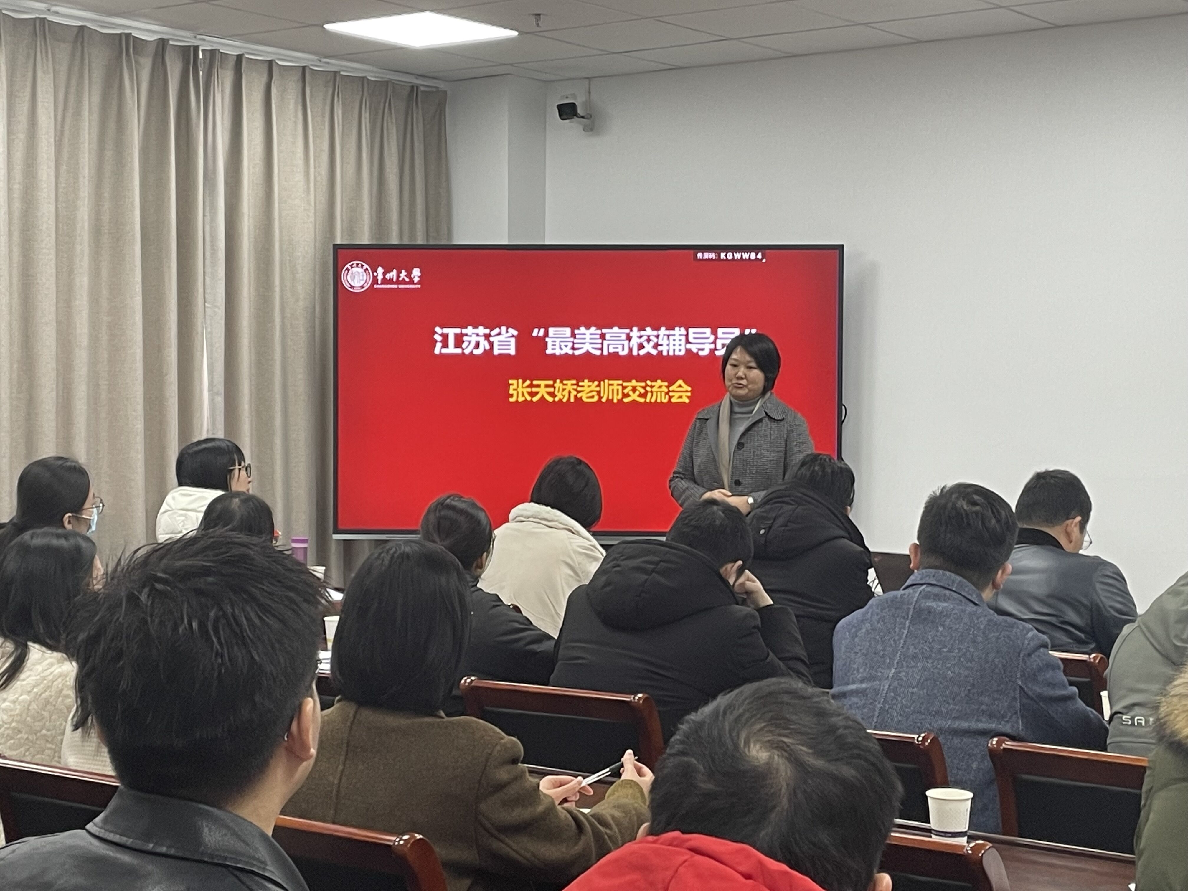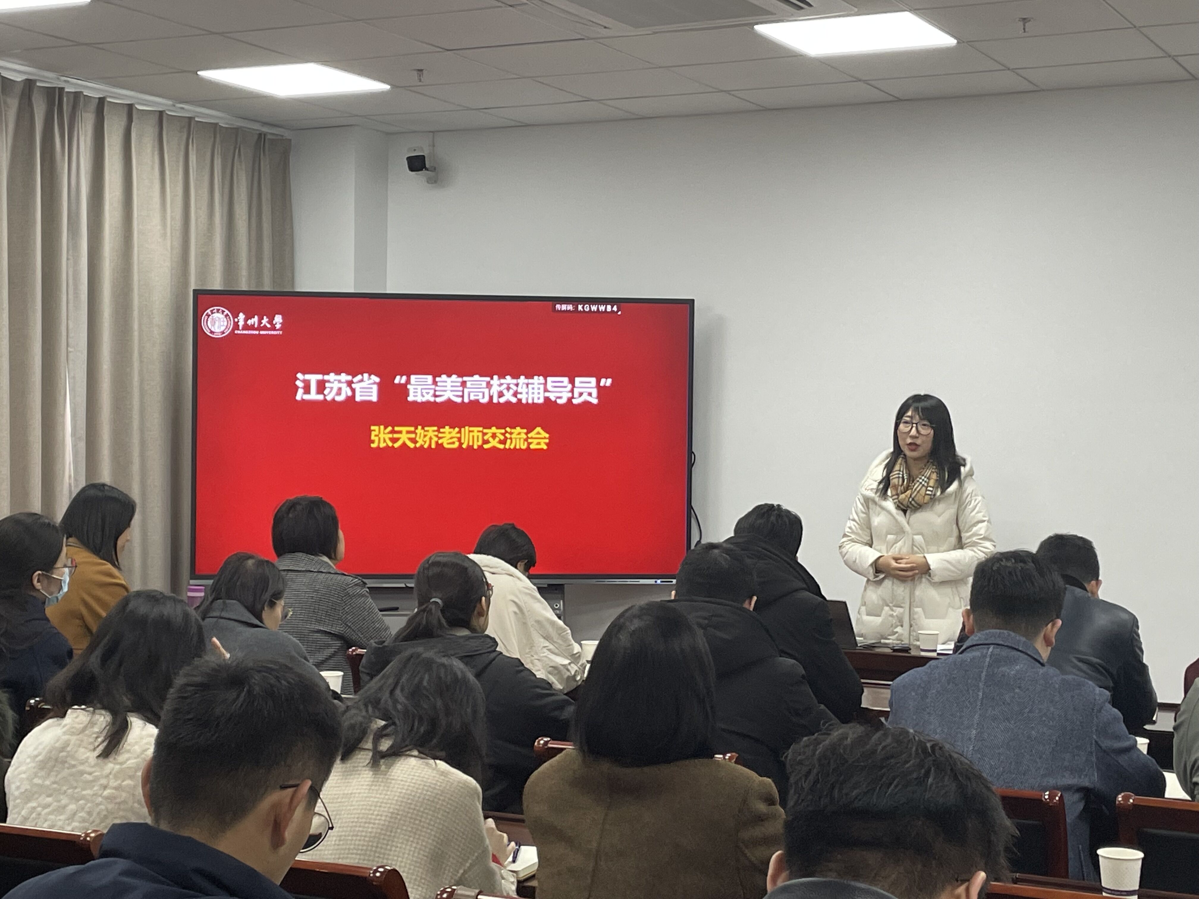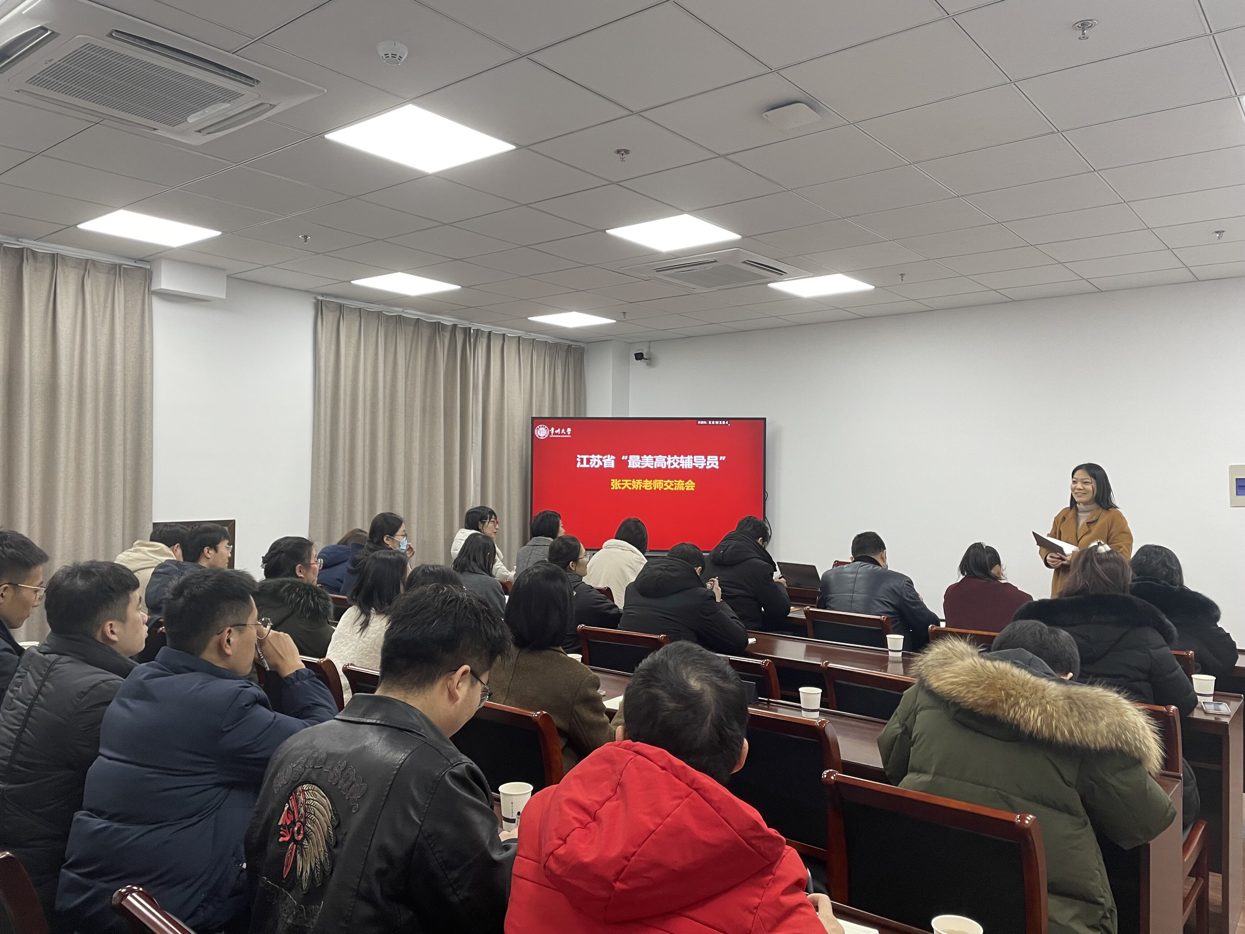 张天娇以《循困应答勇担当,立效长思绘远景》为主题,结合江苏省最美辅导员评选工作的个人思考以及化学与化工学院日常思想政治教育工作进行分享。整个讲座内容丰富,生动形象、特色鲜明,非常贴近学生工作实际,对辅导员素质能力提升和职业生涯发展有很强的指导和借鉴意义。