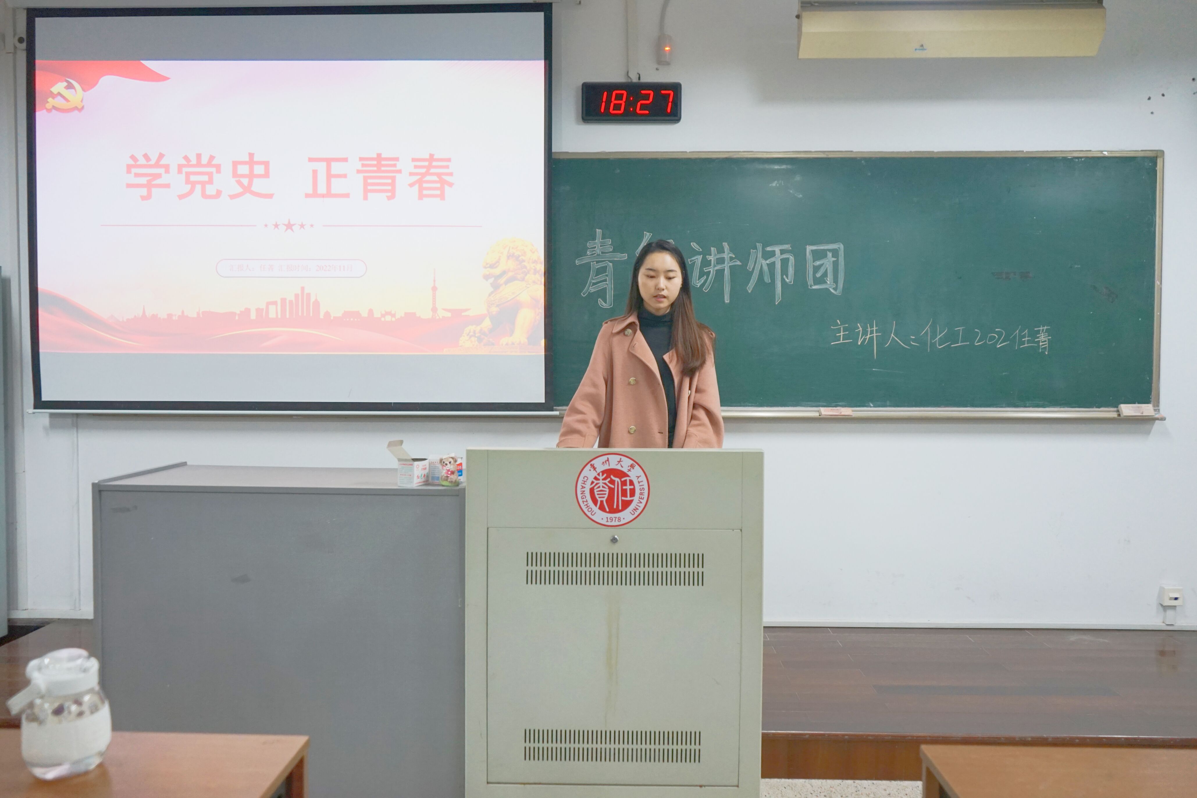 以史为鉴,开创未来,为引领同学们回顾党领导民族复兴的百年奋斗历程,激发同学们的拳拳报国之心。外围官网于2022年11月22日18:30,在辅楼W2108教室组织举办“青年讲师团”系列讲座——“学党史,正青春”。本次讲座由外围官网青年讲师-化工202班任菁主讲,2022级新生代表参与。